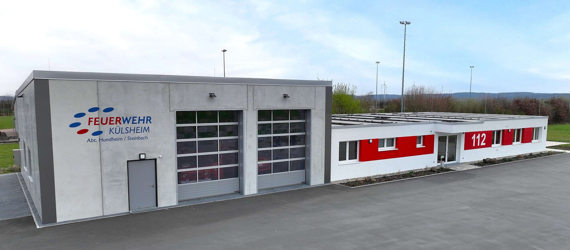 Durch den Zusammenschluss der beiden Feuerwehrabteilungen Hundheim und Steinbach benötigte die Stadt Külsheim ein neues Feuerwehrgerätehaus - natürlich angepasst an den aktuellen Stand der Technik. Die Umsetzung in zweierlei Bauweisen - zum einen Betonfertigteilbau für die Fahrzeughalle und zum anderen modularer Holzbau für die Verwaltung - war vorgegeben.