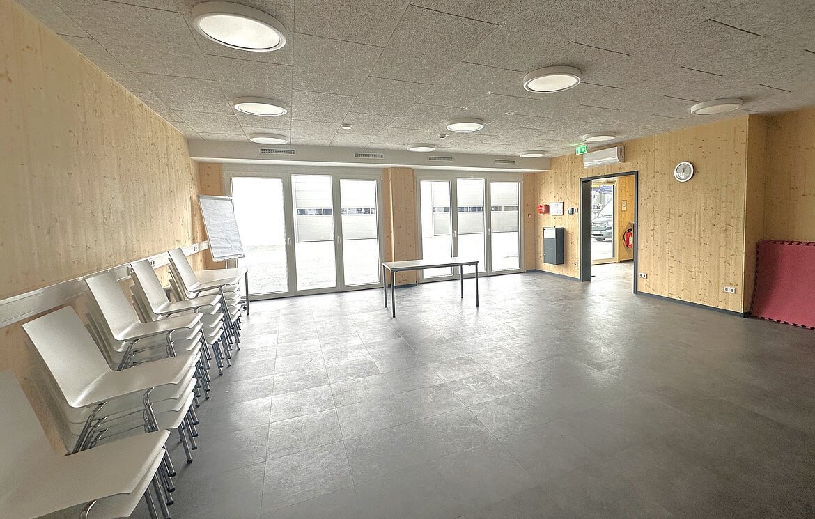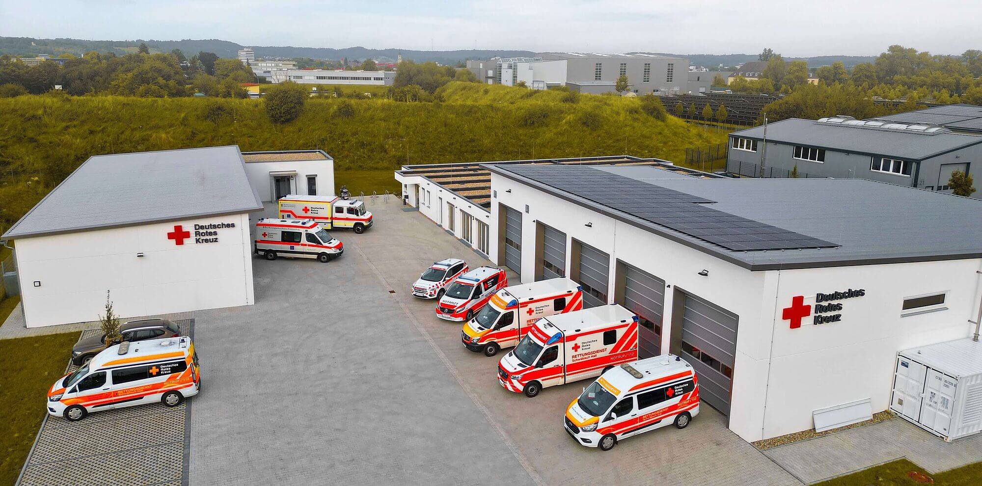 Um den ehrenamtlichen Rettungskräften eine angemessene Unterbringung zu gewährleisten, investierte der DRK-Kreisverband Schwäbisch Hall-Crailsheim in ein neues Bereitschaftsgebäude in Crailsheim. Der Sozialtrakt aus Hybridmodulen bietet nun ausreichend Fläche für Umkleide- und Sanitärbereiche, sowie großzügige Seminar- und Ruheräume. In der großen Fahrzeughalle (inkl. angrenzender Waschhalle), realisiert in Betonsandwichbauweise, haben vier Fahrzeuge einen Stellplatz erhalten.