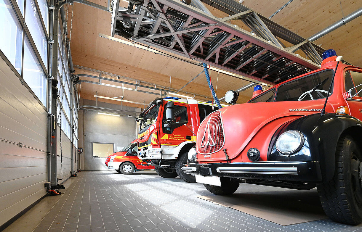 Das bisherige Feuerwehrgebäude in Bad Mergentheim-Wachbach aus dem Jahr 1979 entsprach in keinster Weise mehr den aktuellen Standards - keine getrennten Umkleideräume, keine Heizung und ein unzureichender Sanitärbereich. Um auch der wachsenden Anzahl an Feuerwehr-Nachwuchskräften entsprechende Aus- und Weiterbildungsräumlichkeiten bieten zu können, entschied man sich für einen Neubau. Dieser wurde 2023/2024 in zweigeschossiger Modulbauweise mit nebenliegender Fahrzeughalle umgesetzt.