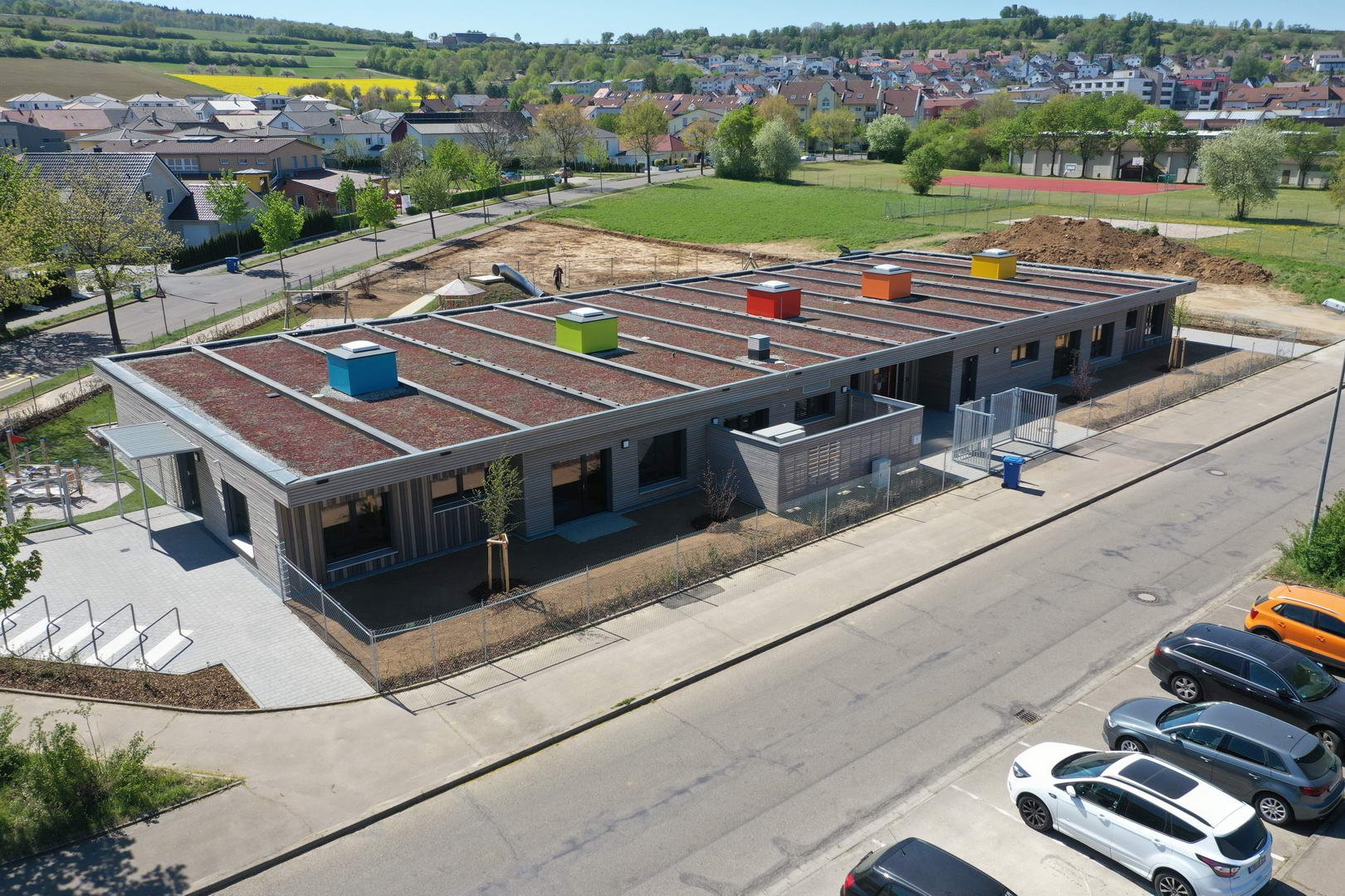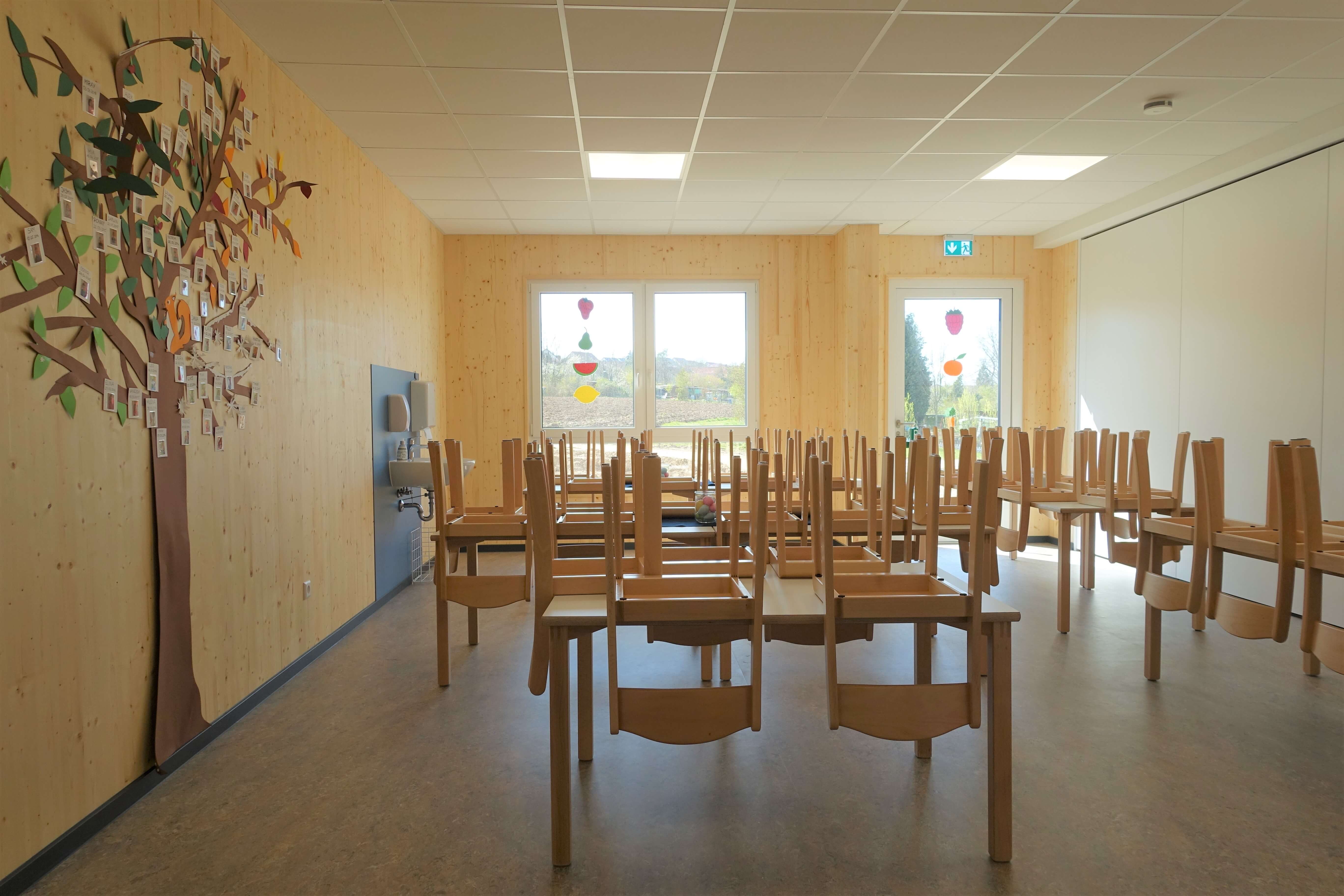 Zwischen Beauftragung und Fertigstellung der neuen Kindertagesstätte im Hardthausener Ortsteil Gochsen vergingen nur fünf Monate. Die 12 Module stehen zwei Ganztages- und einer Krippengruppe zur Verfügung. Durch die geschickte Anordnung der Module entstand ein großzügiger Foyerbereich, der sowohl als Küchen- & Essbereich dient, als auch genügend Raum für Veranstaltungen bietet.