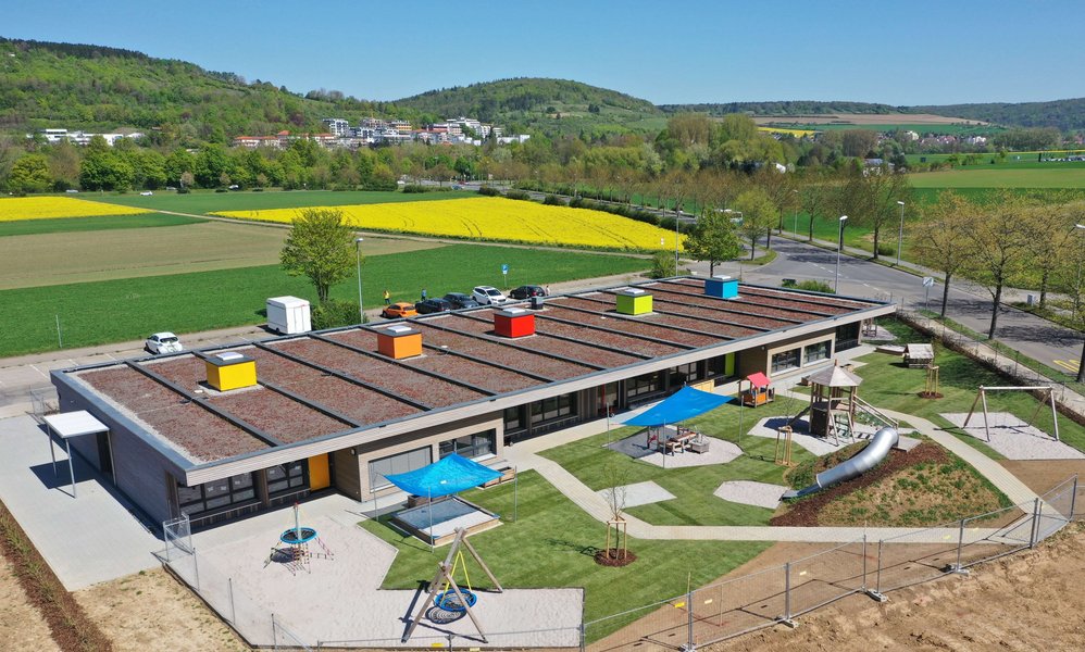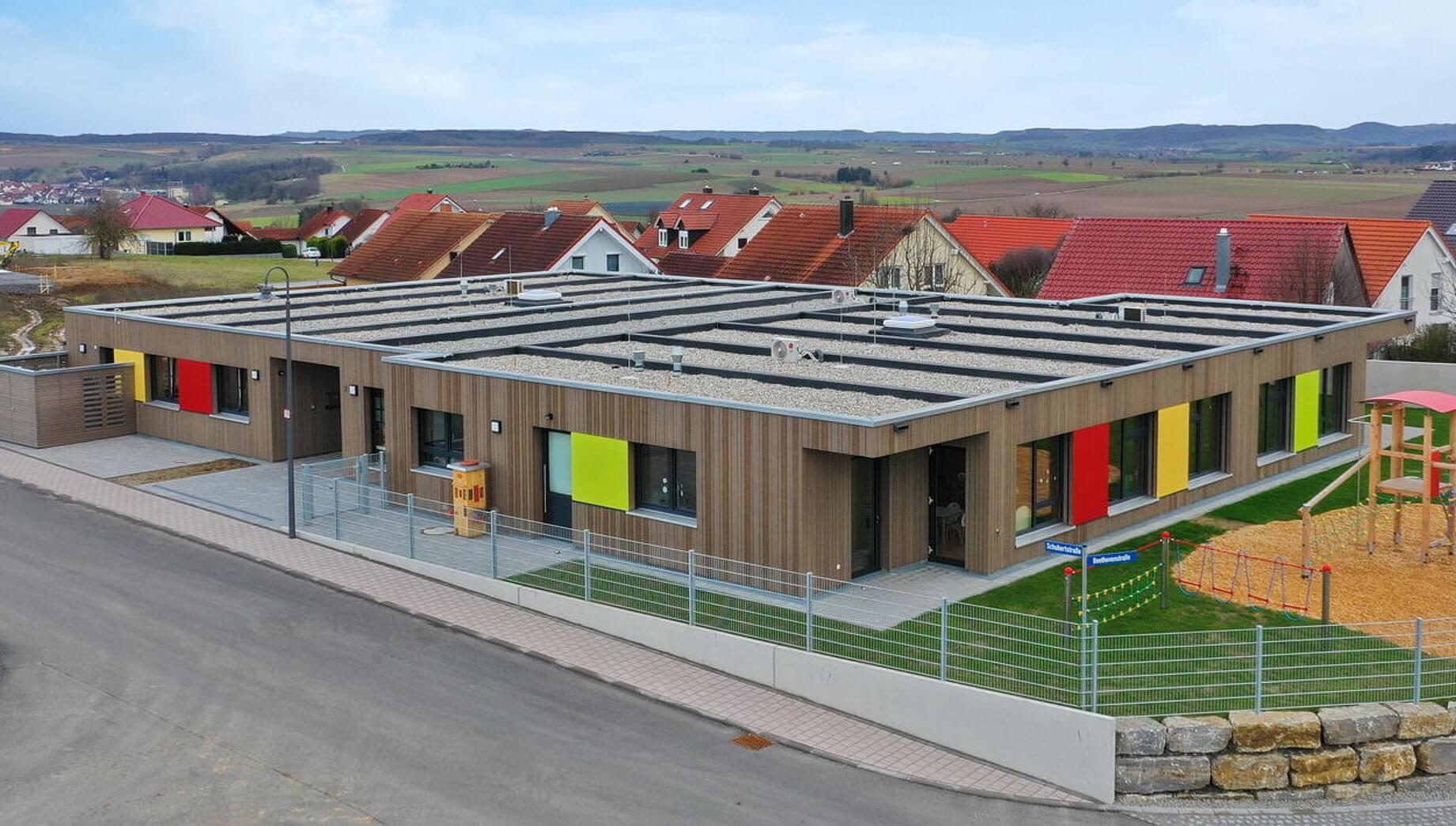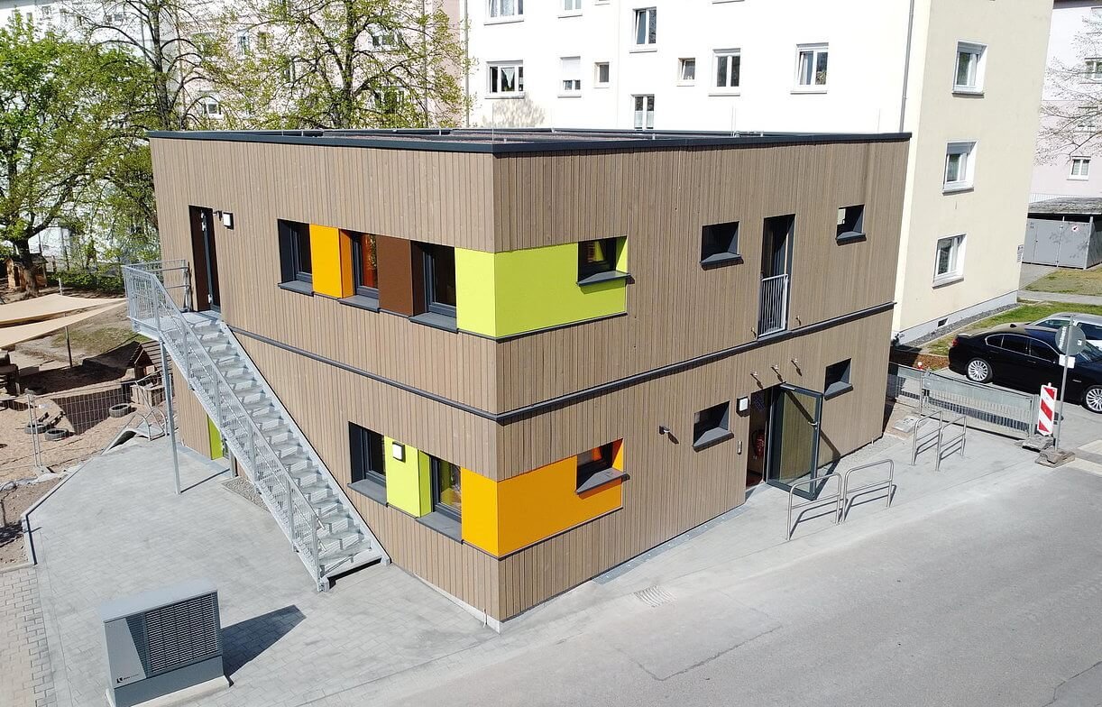 Der Kindergarten im Auenland wird von den Kinderzentren Kunterbunt aus Nürnberg betrieben. Aus insgesamt 14 Modulen besteht die neue Tagesstätte “Spielwiese Kunderbunt” und bietet damit 76 Kindern Platz zum Spielen, Lernen und Spaß haben. Mit unserer Modulbauweise aus Beton und Massivholz haben wir hier nicht nur dringend benötigten Raum geschaffen, sondern auch eine gesunde Atmosphäre für die Kleinsten.