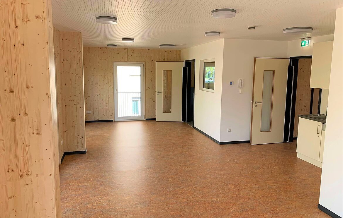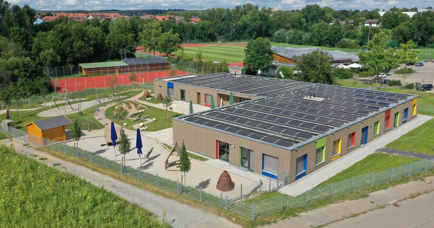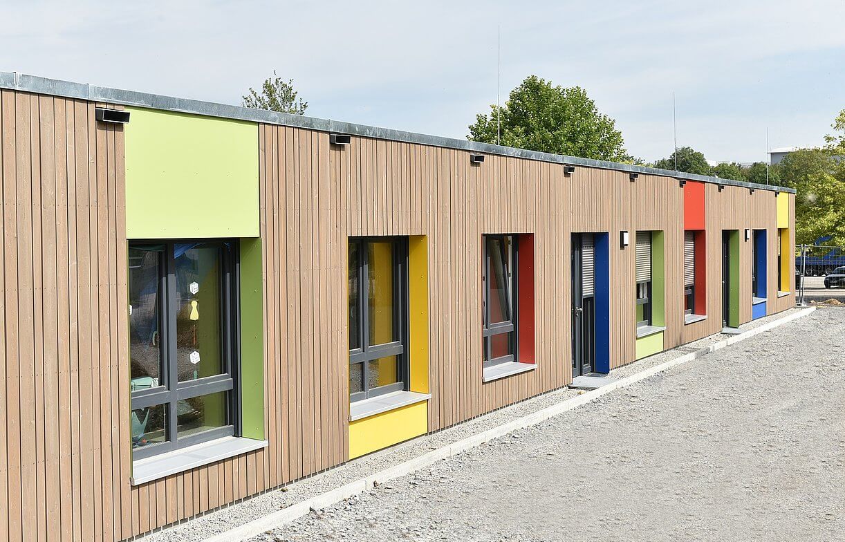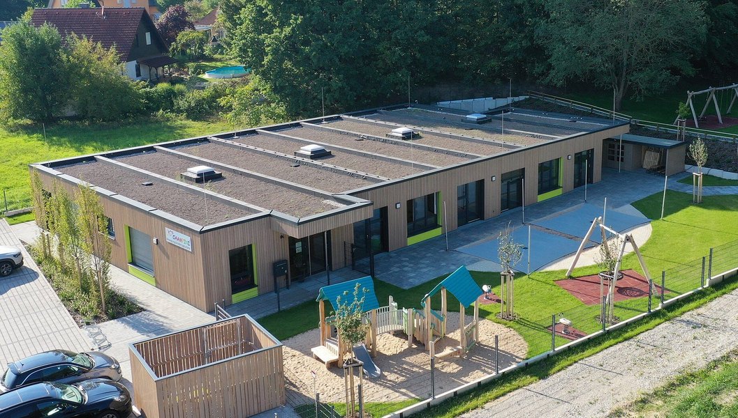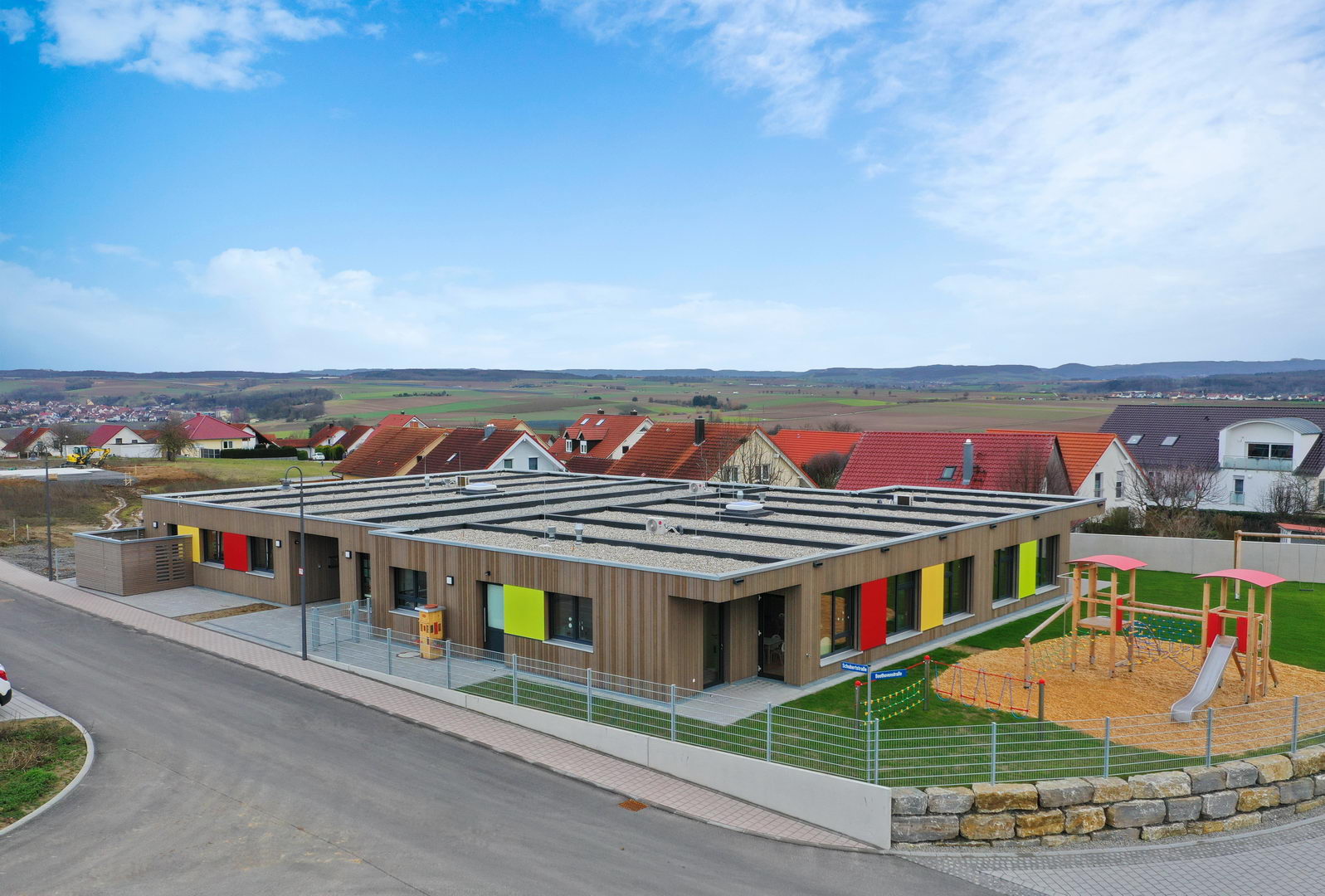Der neue Kindergarten im Auenland wird von den Kinderzentren Kunterbunt aus Nürnberg betrieben. Aus insgesamt 14 Modulen besteht die neue Tagesstätte “Spielwiese Kunterbunt” und bietet damit 76 Kindern Platz zum Spielen, Lernen und Spaß haben. Mit unserer Modulbauweise aus Beton und Massivholz haben wir hier nicht nur dringend benötigten Raum geschaffen, sondern auch eine gesunde Atmosphäre für die Kleinsten.