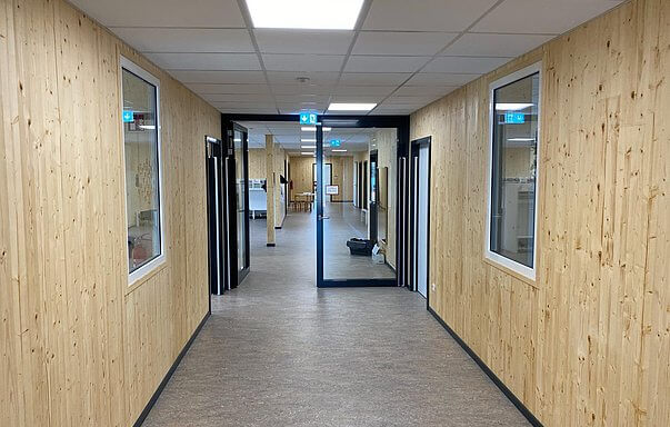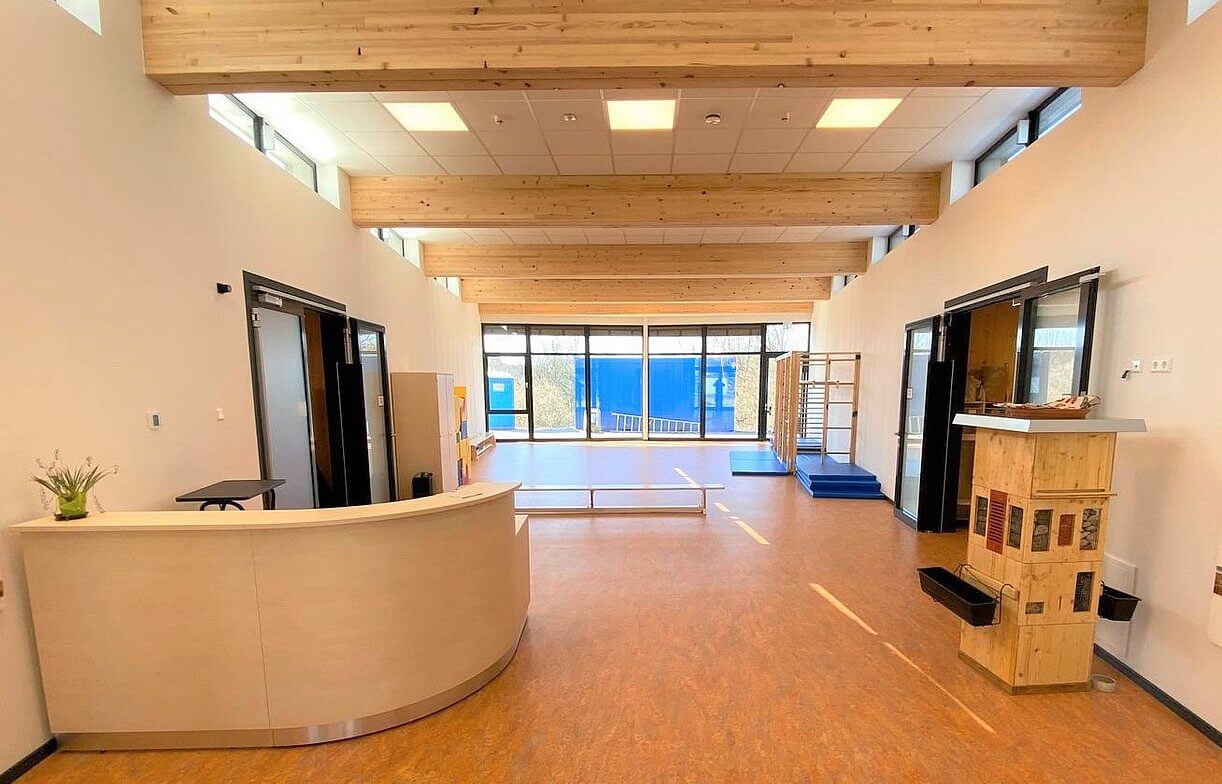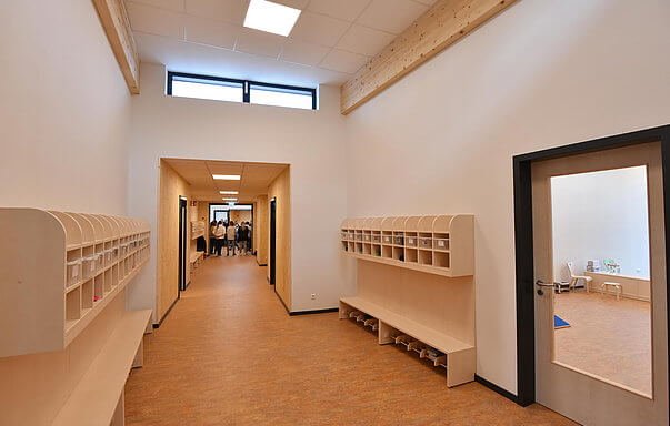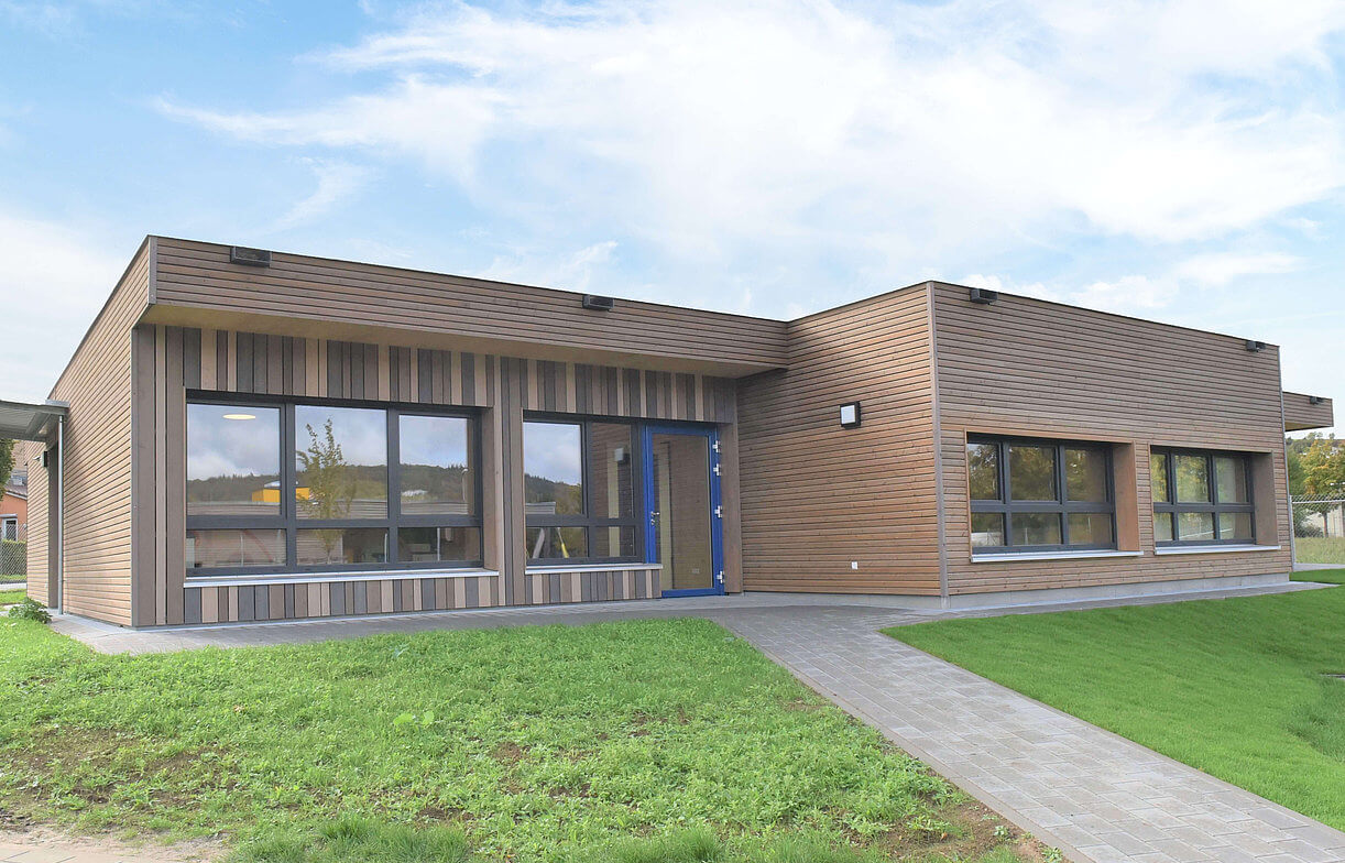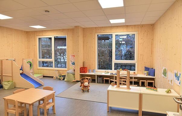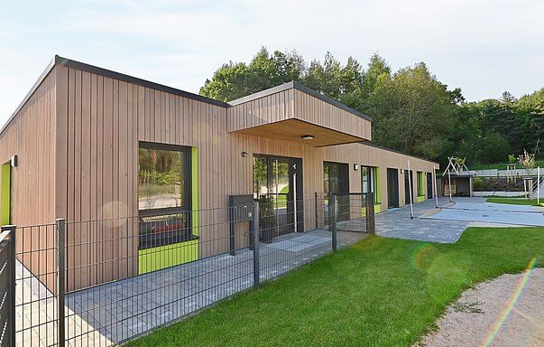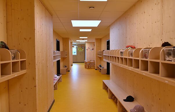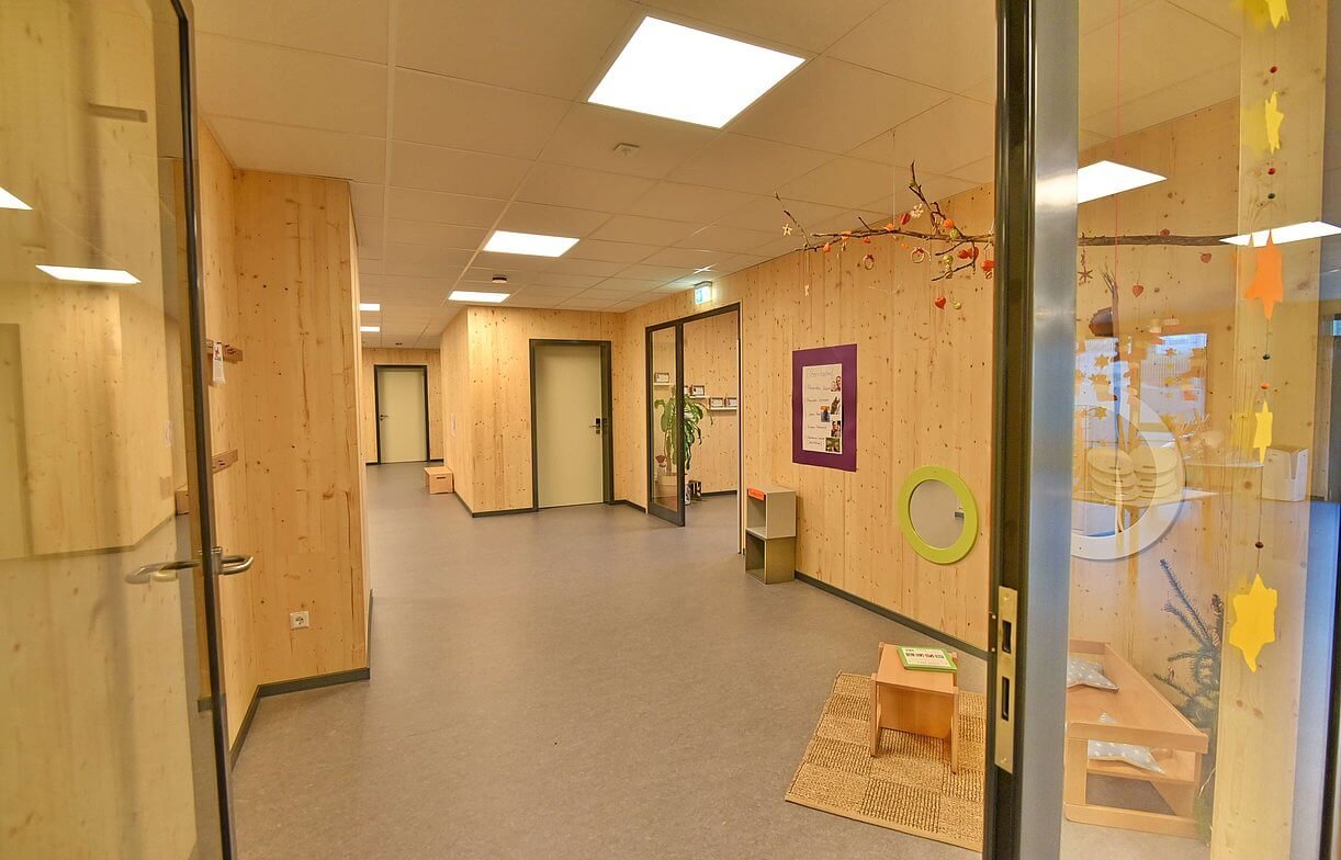 Nachdem aufgrund der Hanglage einige Erdregulierungsarbeiten geleistet werden mussten, war der Kindergarten in Bretzfeld-Bitzfeld ab Montage der Module nach 3 Monaten bezugsbereit. Nun freuen sich die Kinder der "Bitzfelder Wuselhütte" über zwei Gruppen- und Nebenräume, Sanitär- und Personalbereiche sowie einen Mehrzweckraum mit Kreativbereich - dank unserem Massivholz inklusive gemütlicher Atmosphäre.