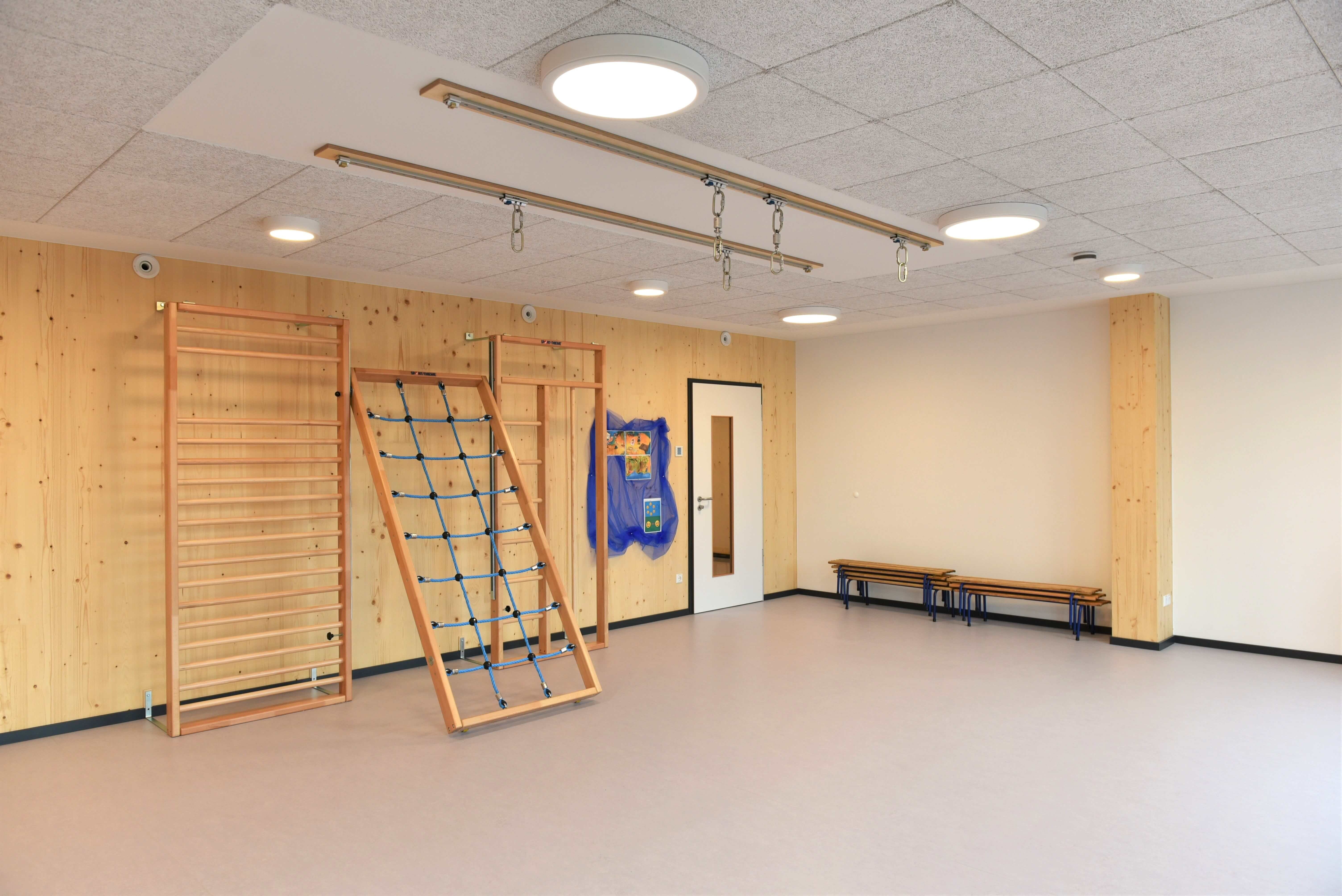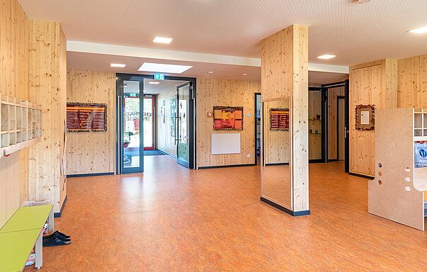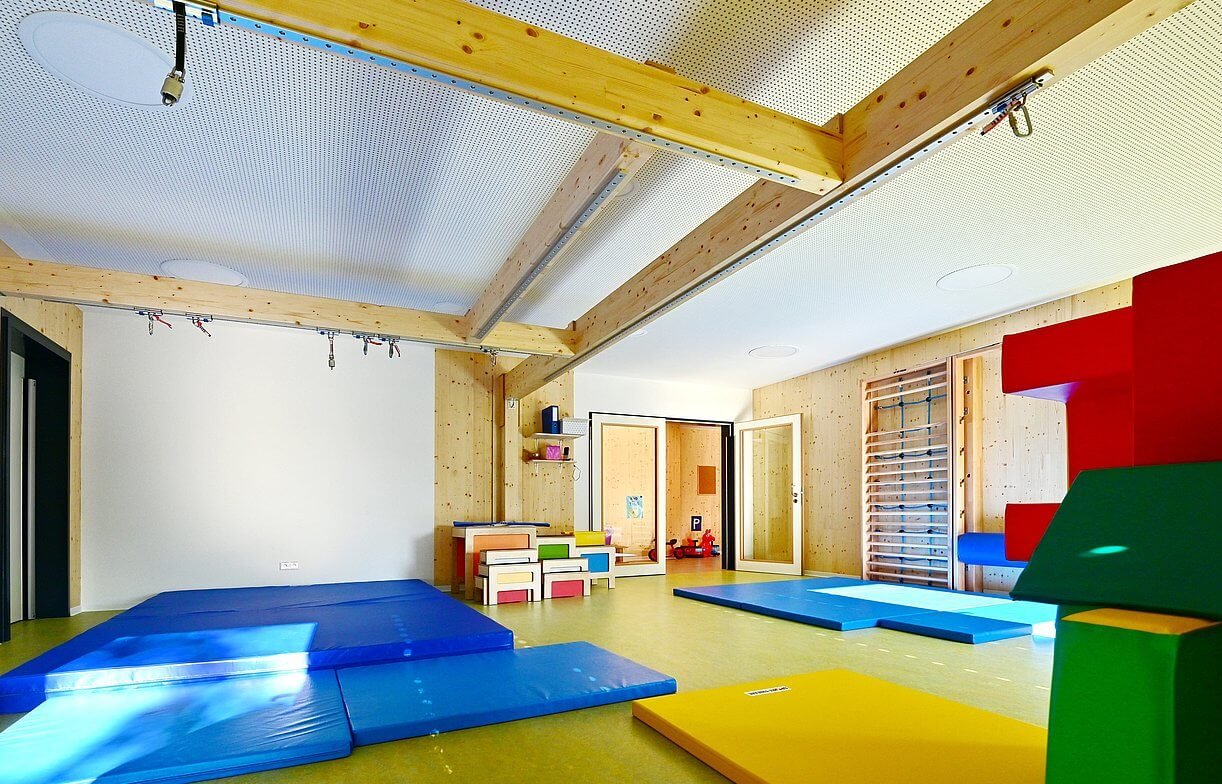 Mittelpunkt der Bewegungskita im bayerischen Heroldsbach-Oesdorf ist natürlich der große Bewegungs-/Mehrzweckraum, dem zwei weitere multifunktionale Gruppenräume mit entsprechenden Nebenräumen gegenüberliegen. Die Einrichtung verfügt zudem über einen Speiseraum inkl. Küche sowie Räumlichkeiten für Eltern und Mitarbeitende.