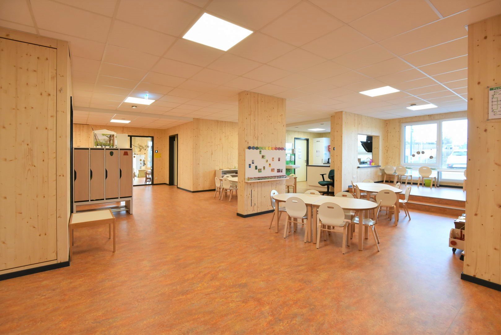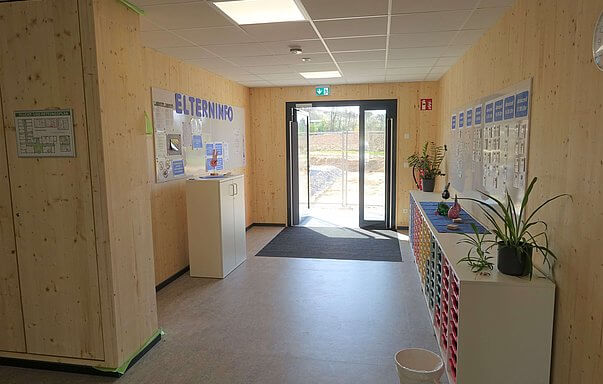 Zwischen Beauftragung und Fertigstellung der neuen Kindertagesstätte im Hardthausener Ortsteil Gochsen vergingen nur fünf Monate. Die 12 Module stehen zwei Ganztages- und einer Krippengruppe zur Verfügung. Durch die geschickte Anordnung der Module entstand ein großzügiger Foyerbereich, der sowohl als Küchen- & Essbereich dient, als auch genügend Raum für Veranstaltungen bietet.