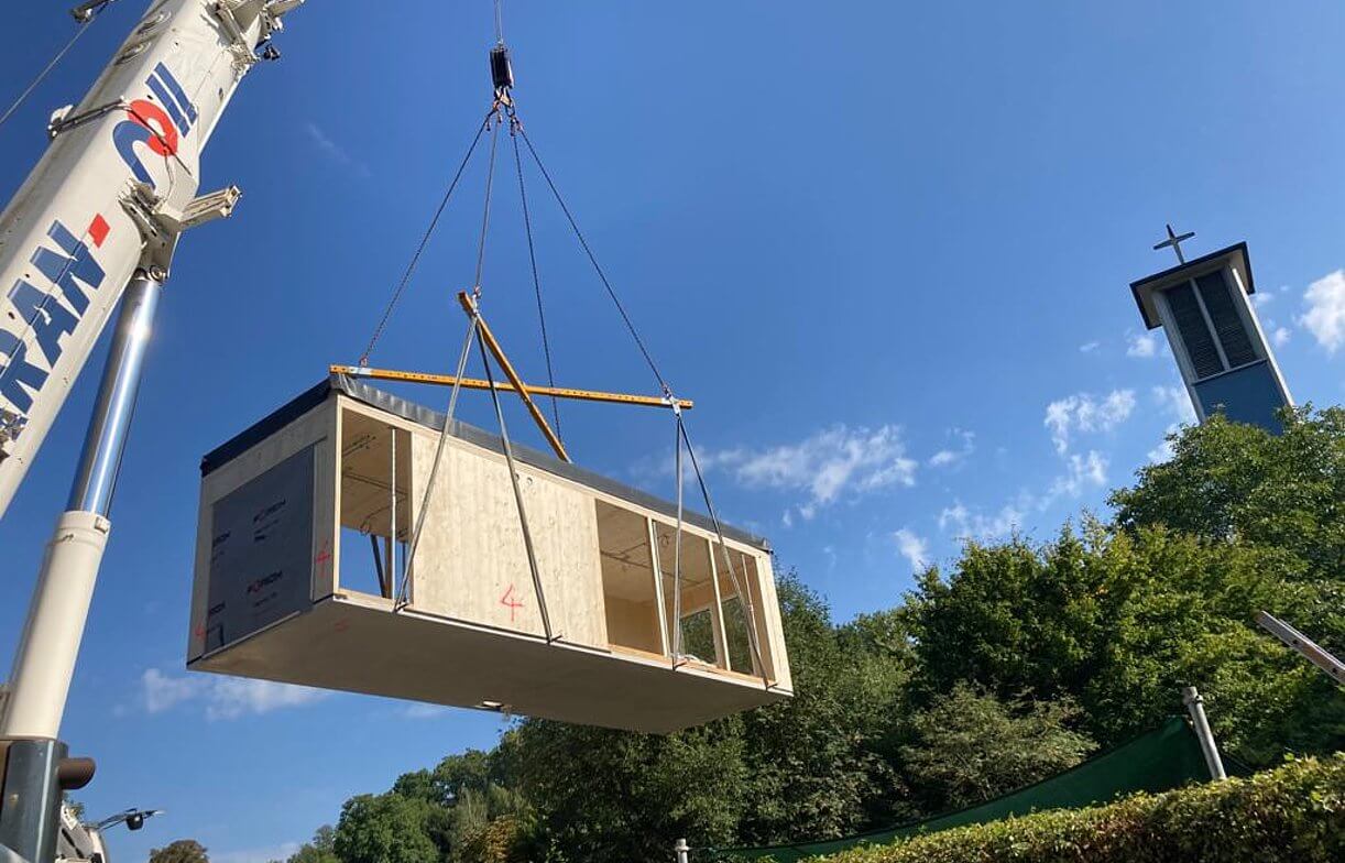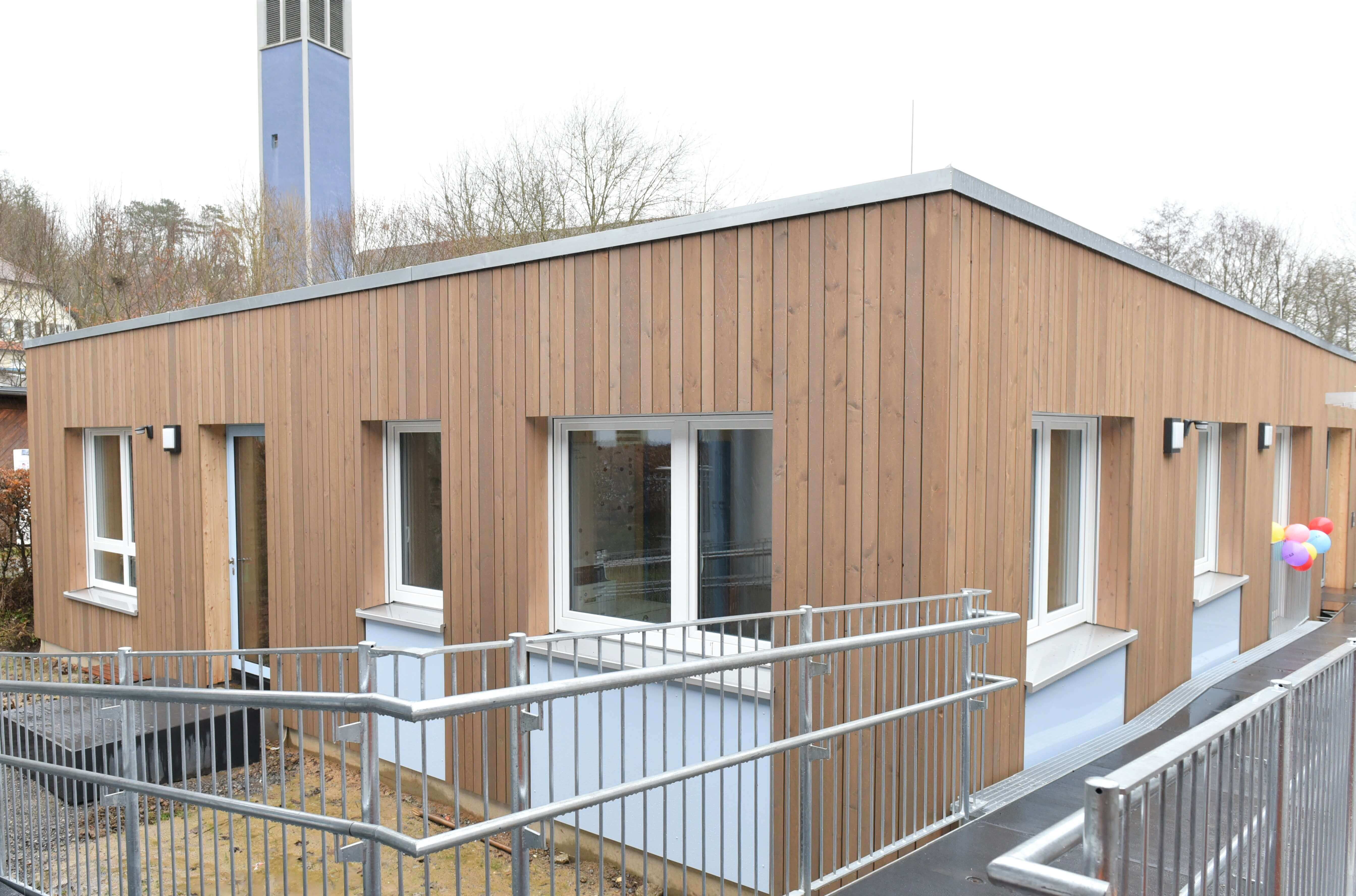 Die sechs Module - zweistöckig aufgestellt - bilden die Erweiterung der bestehenden Kindertagesstätte und wurden Anfang Mai 2021 bezogen.